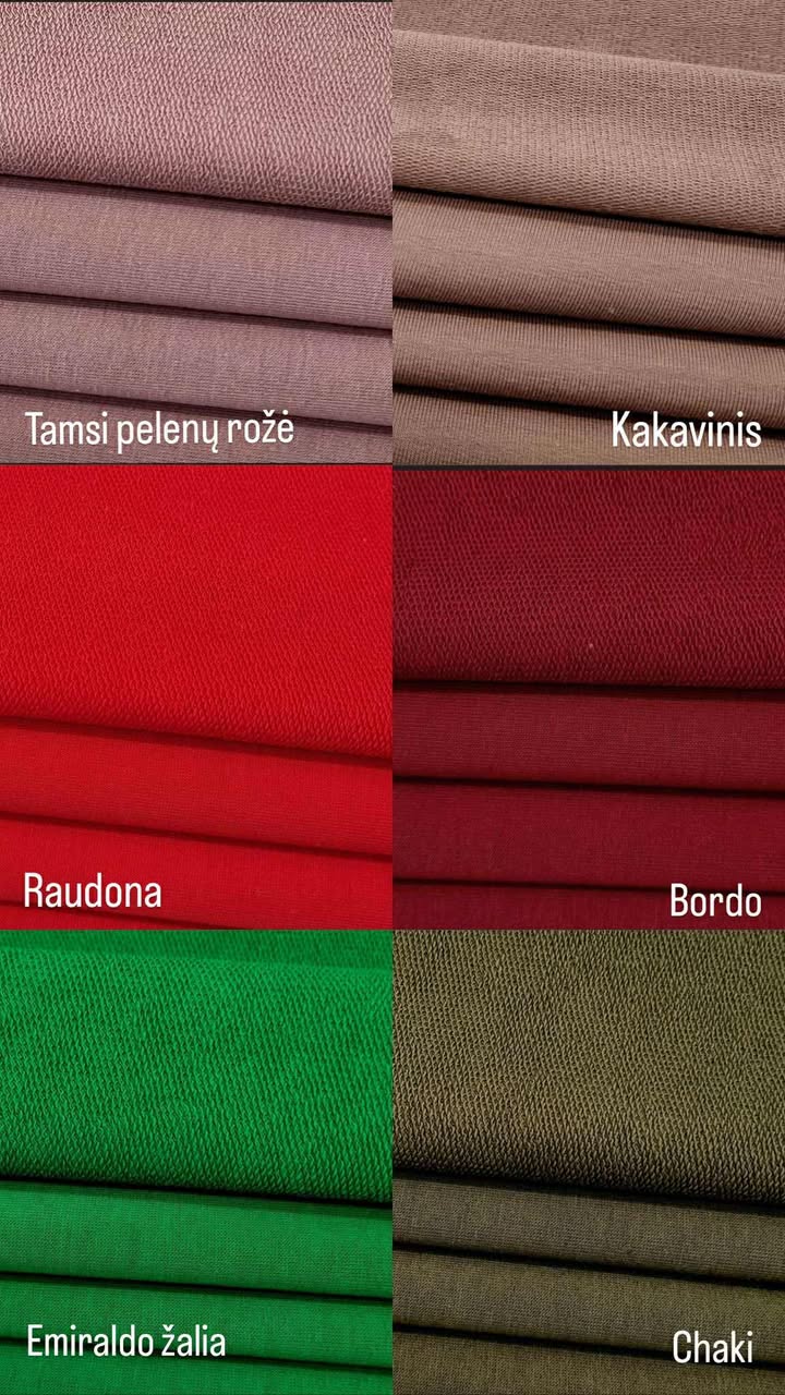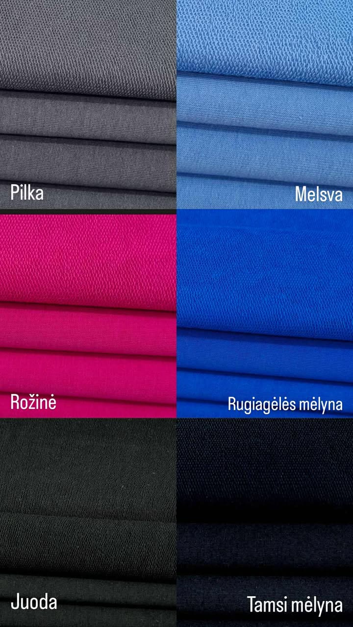 | Spalva | Pilka, Melsva, Rožinė, Rugiagėlės mėlyna, Juoda, Tamsi mėlyna, Tamsi pelenų rožė, Kakavinis, Raudona, Bordo, Emiraldo žalia, Chaki |